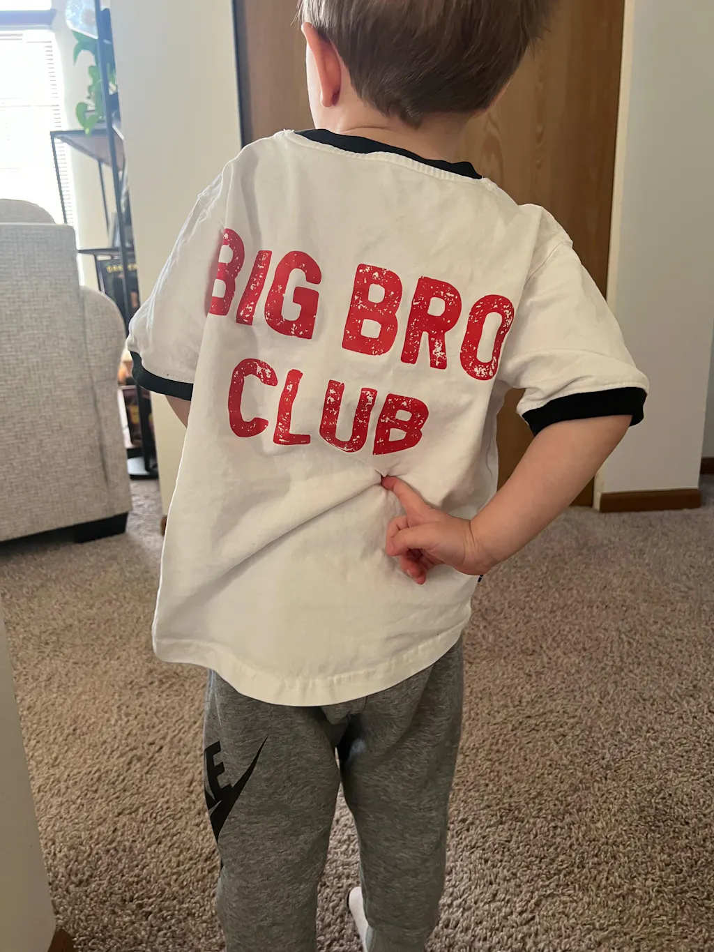 Show off your little one's big brother pride with our Big Bro Club Tee. Featuring bold front and back text and a contrasting collar and drop hem in the back, this shirt is perfect for any older sibling. Join the club today!